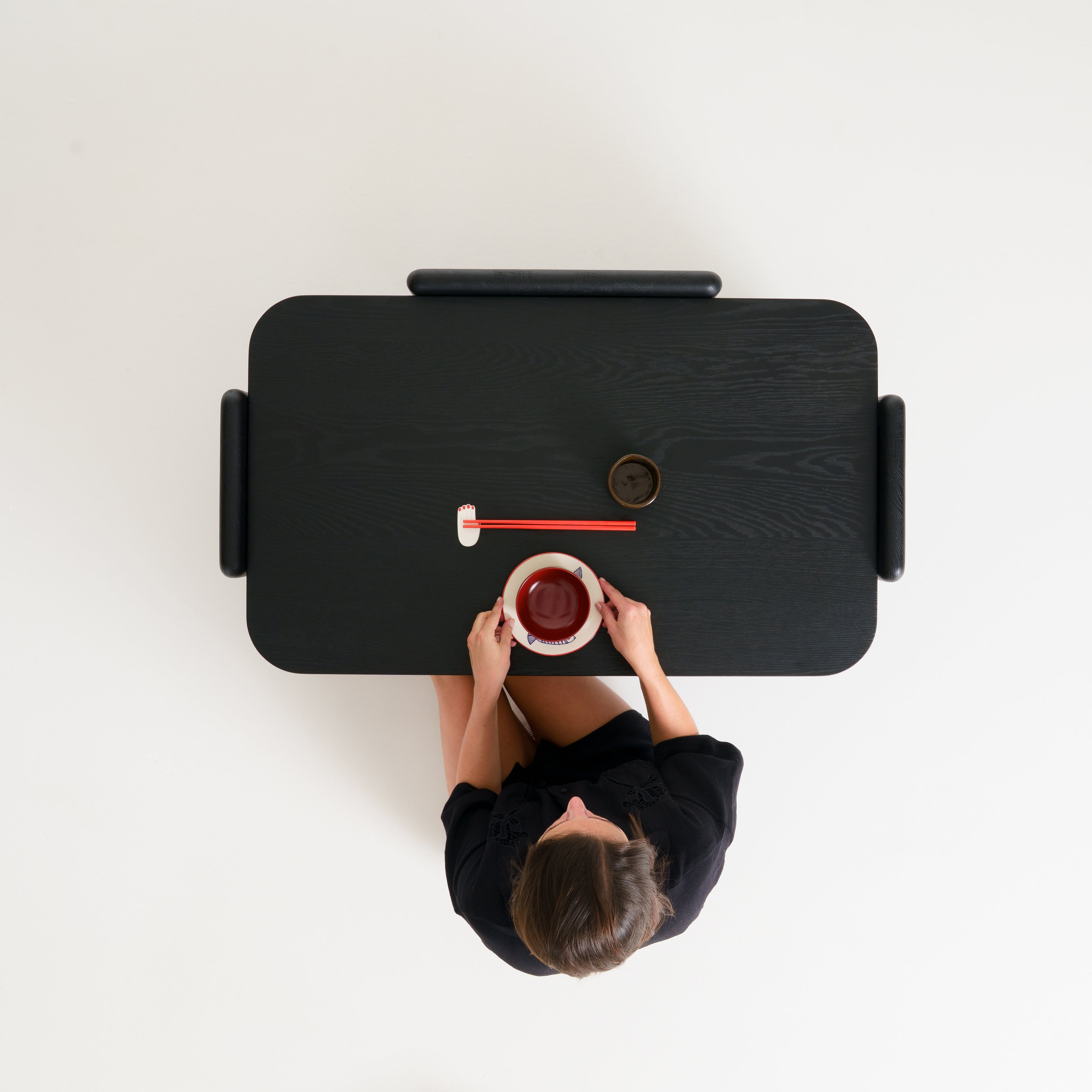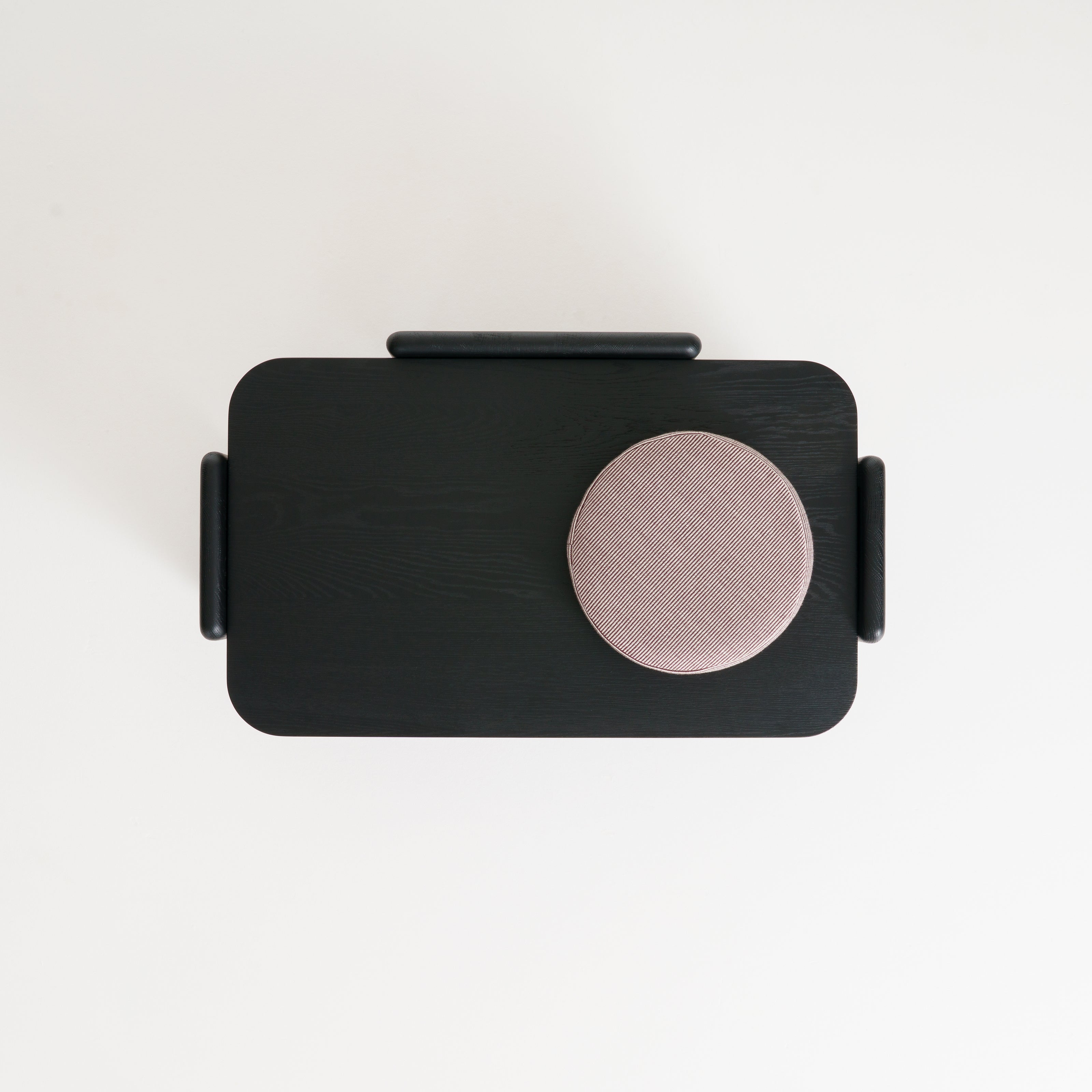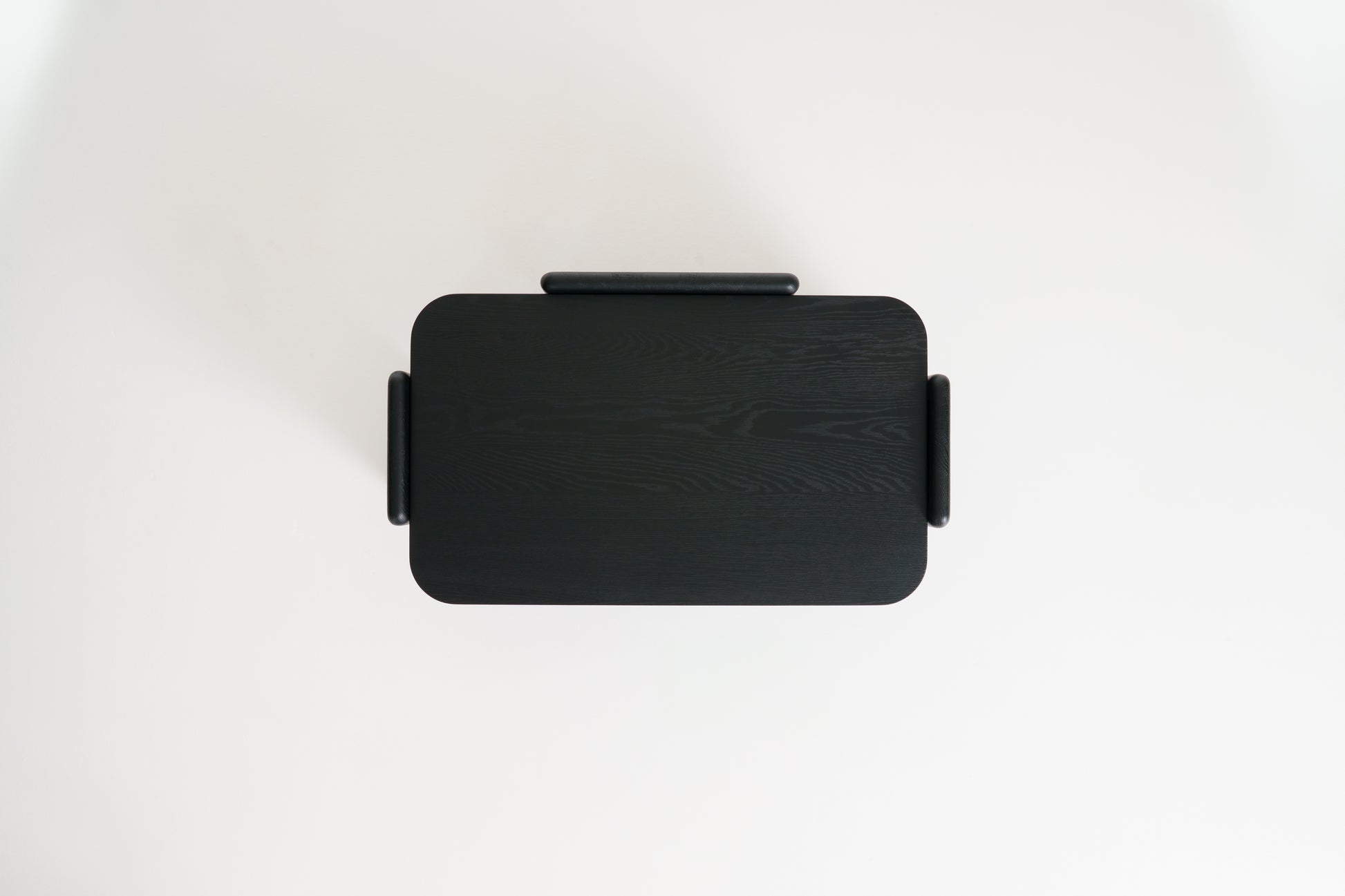 The side table is crafted by hand. Brushed oak side panels, finished in a sleek black lacquer, add a tactile depth and architectural edge. The three-layer plywood reclining surface ensures outstanding stability and durability.
