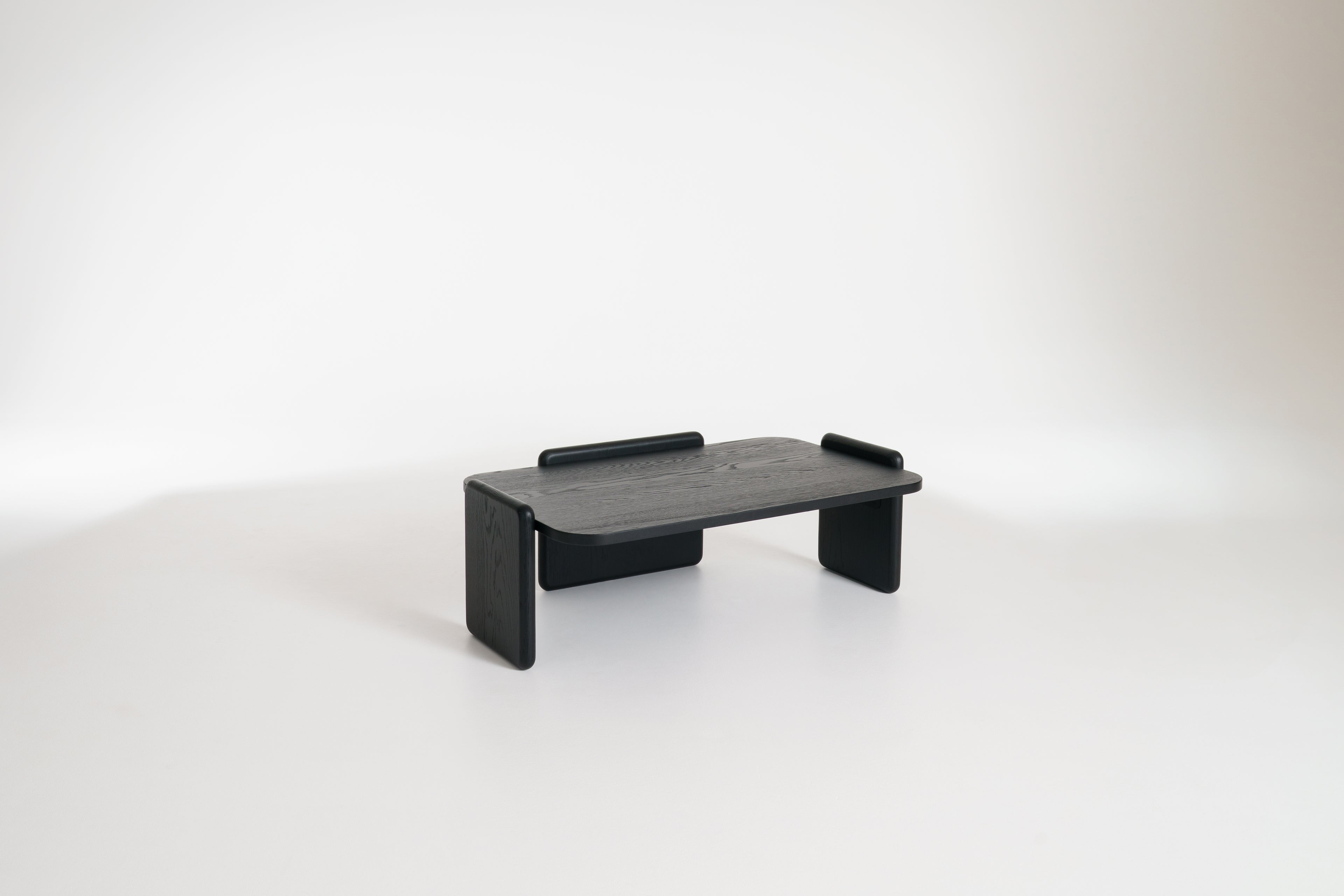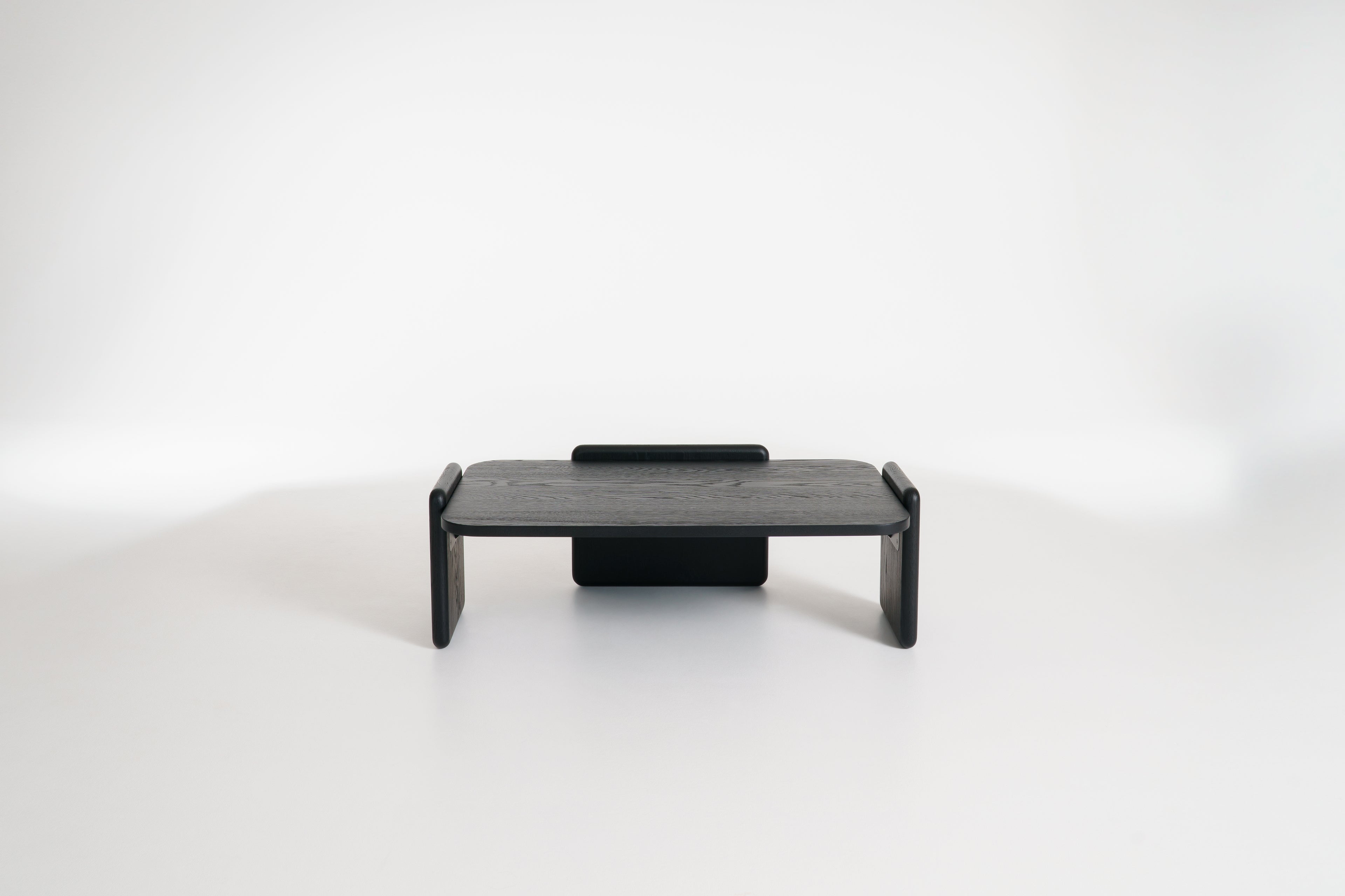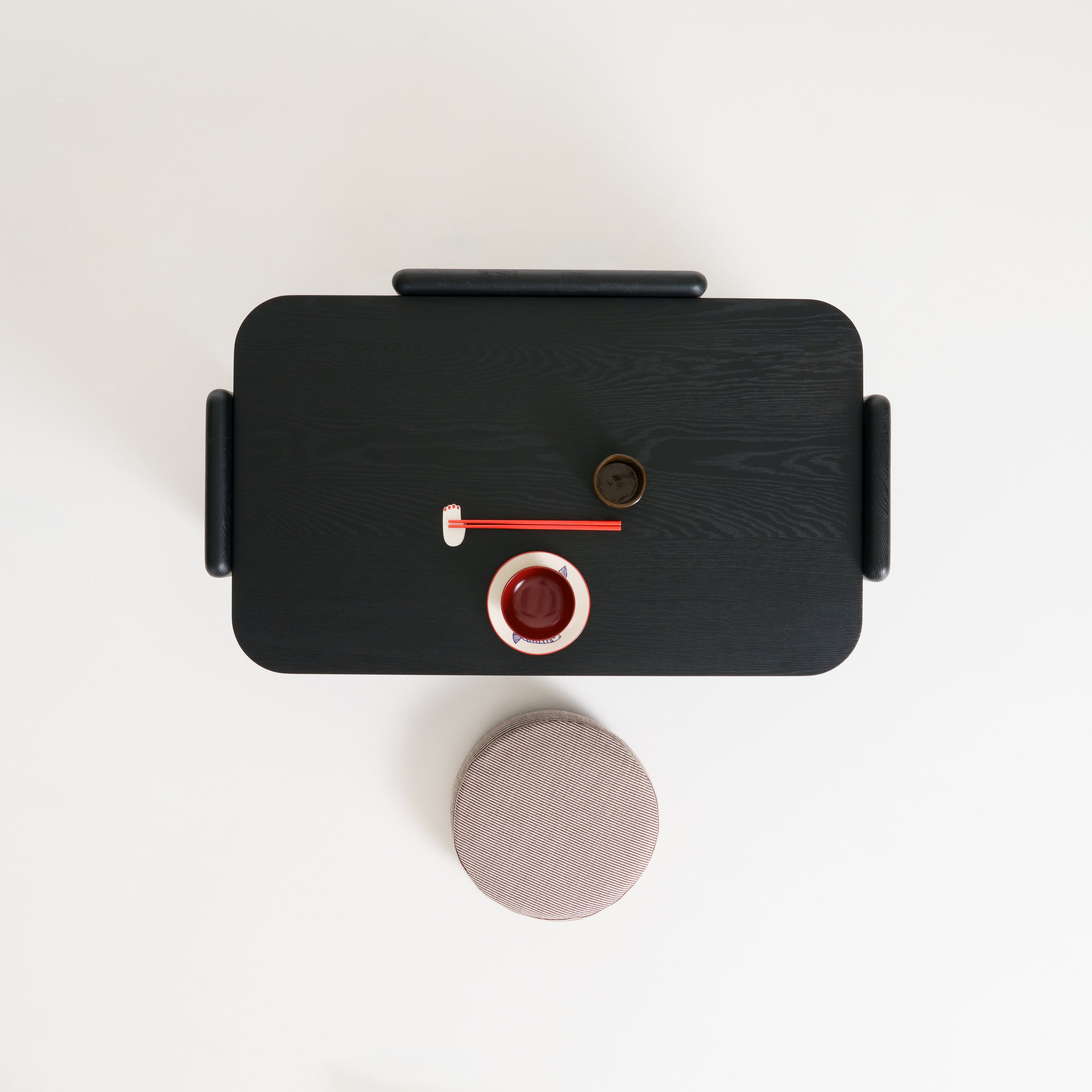 The side table is crafted by hand. Brushed oak side panels, finished in a sleek black lacquer, add a tactile depth and architectural edge. The three-layer plywood reclining surface ensures outstanding stability and durability.