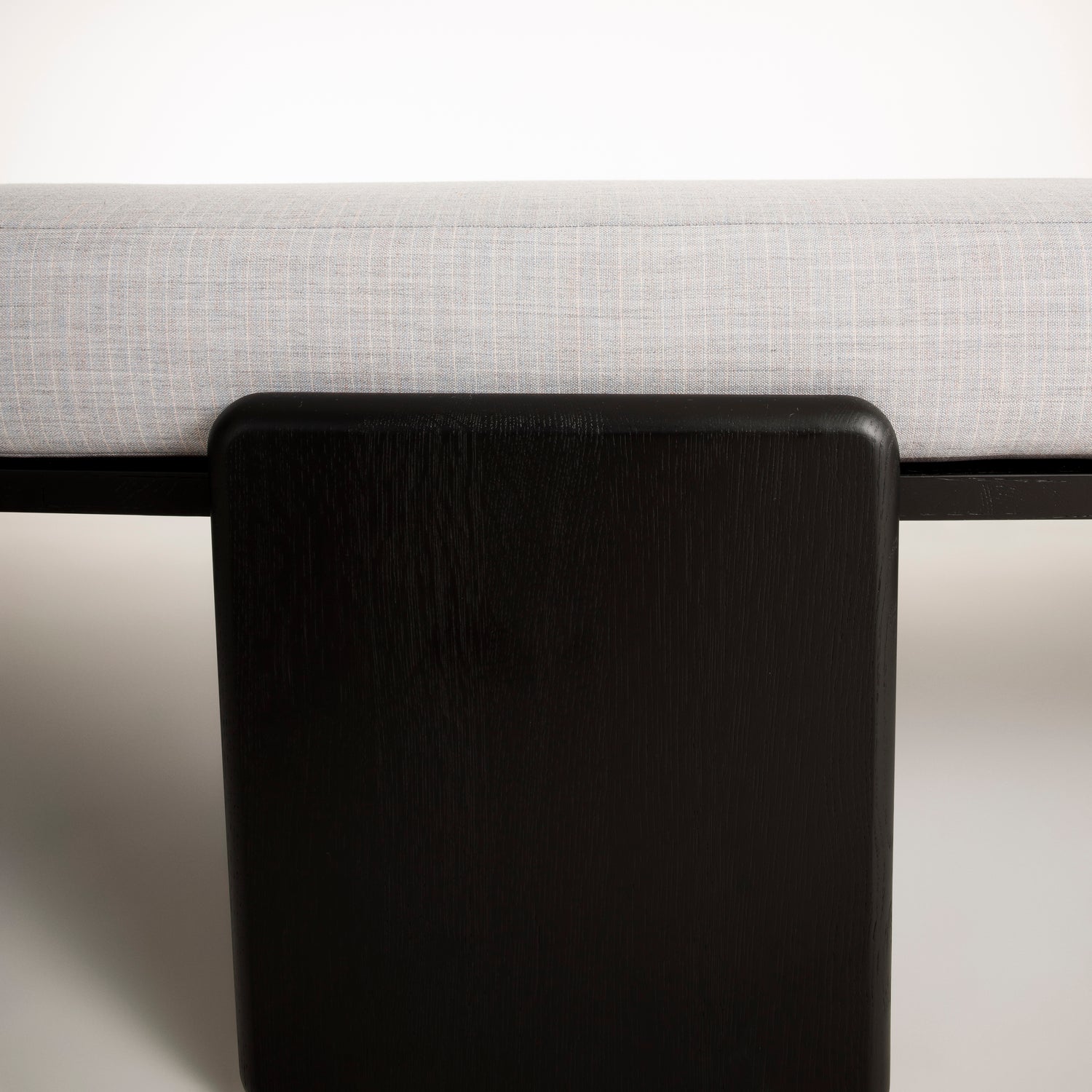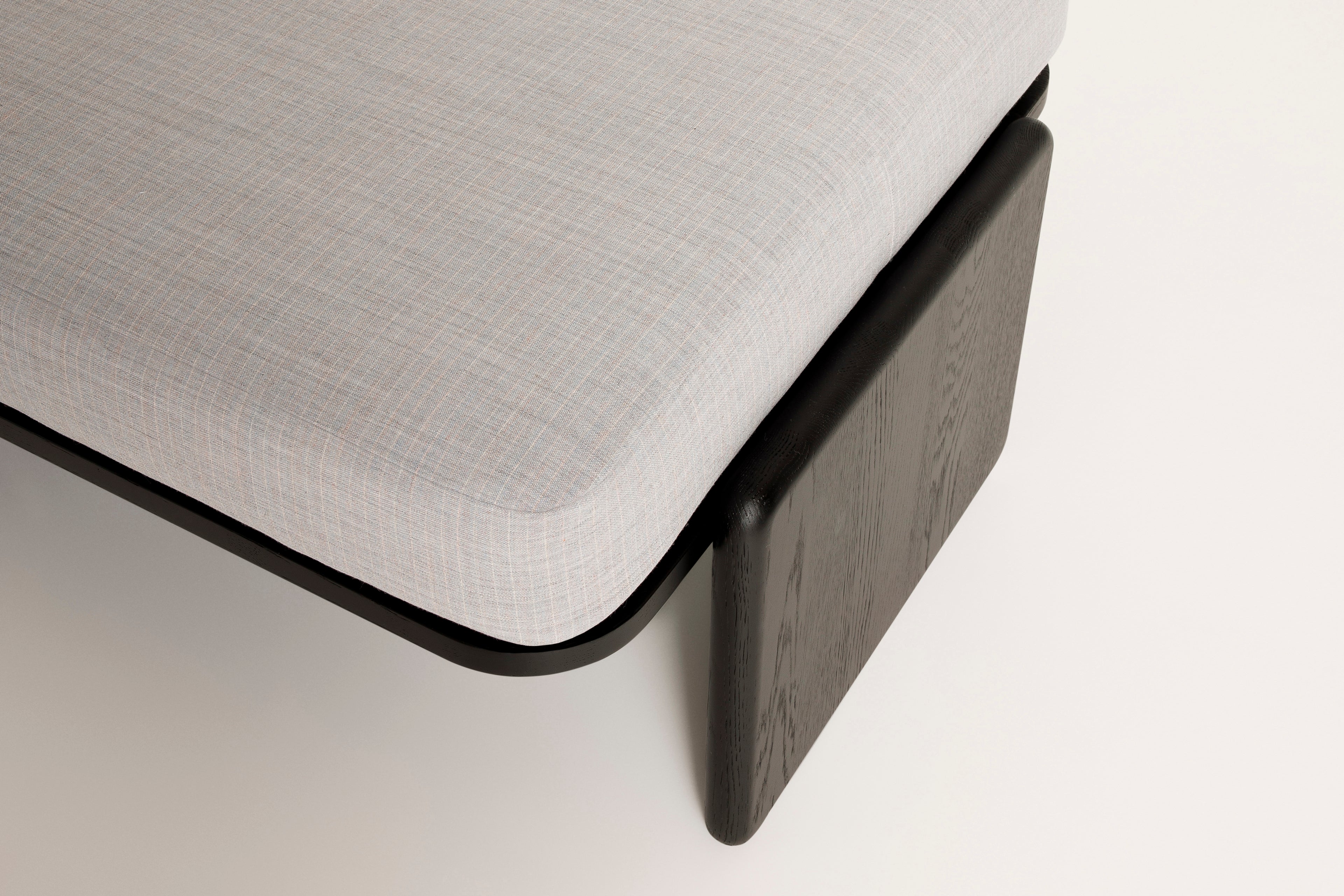 The high-quality frame is crafted by hand. Brushed oak side panels, finished in a sleek black lacquer, add a tactile depth and architectural edge. The three-layer plywood reclining surface ensures outstanding stability and durability.