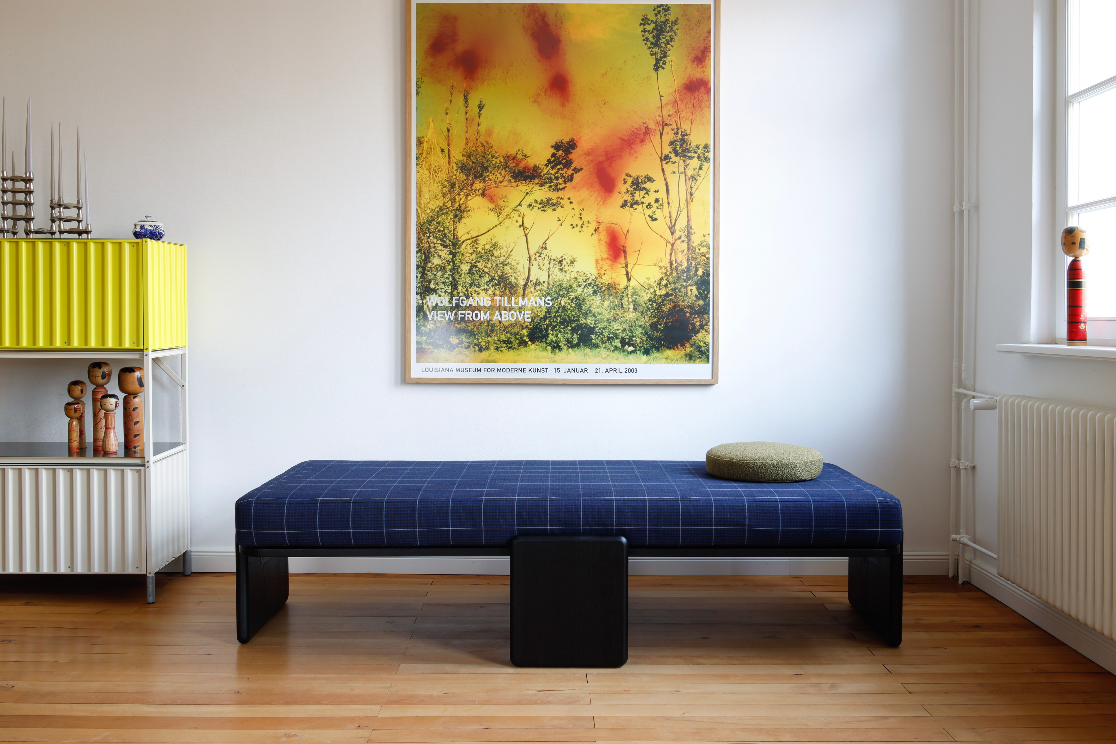 A unique furniture piece combining Italian handmade upholstery, a finely crafted wooden frame made in Germany with metal brackets crafted in the Netherlands, Norwegian fabrics and sewn in Germany.