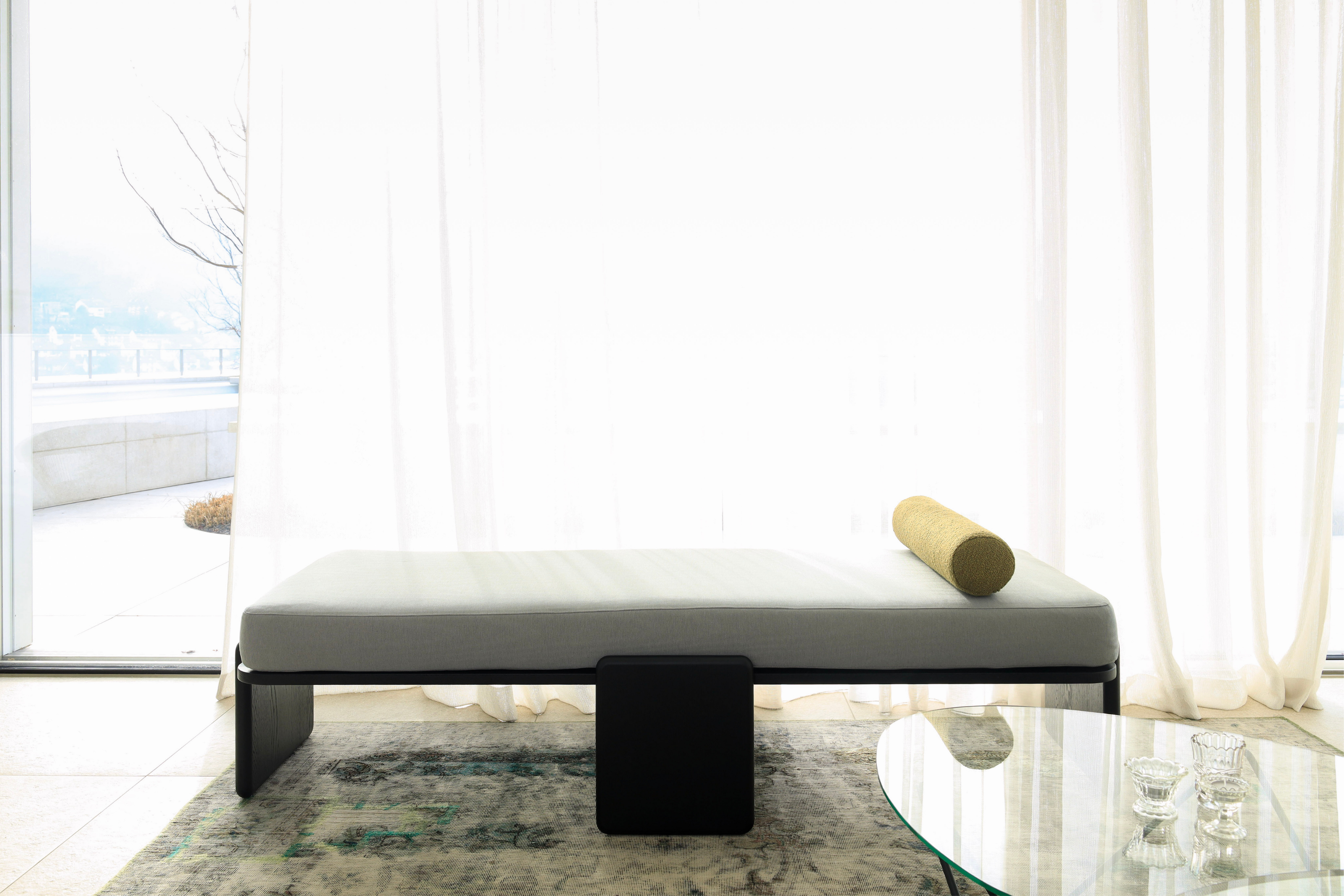 The high-quality frame is crafted by hand. Brushed oak side panels, finished in a sleek black lacquer, add a tactile depth and architectural edge. The three-layer plywood reclining surface ensures outstanding stability and durability.