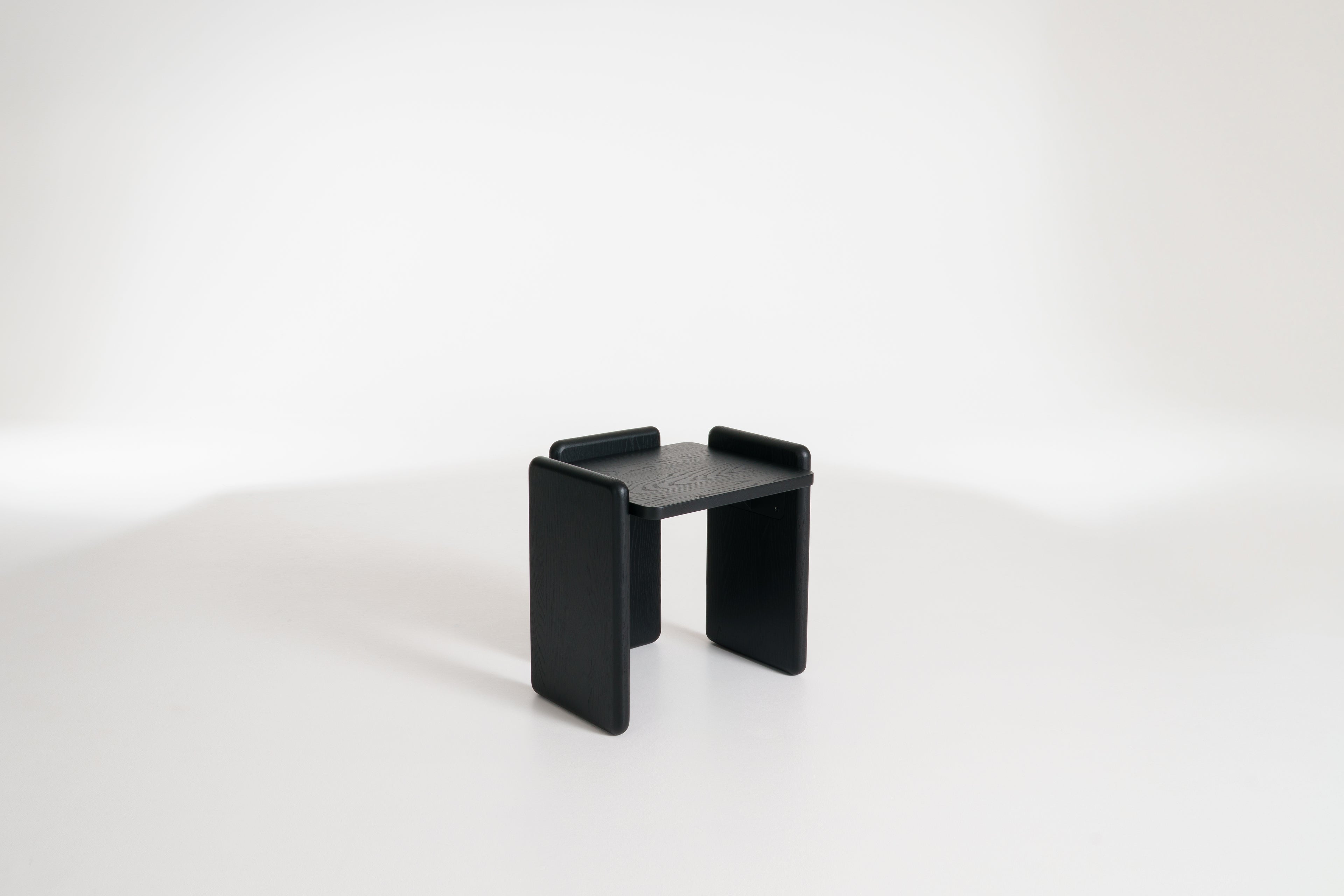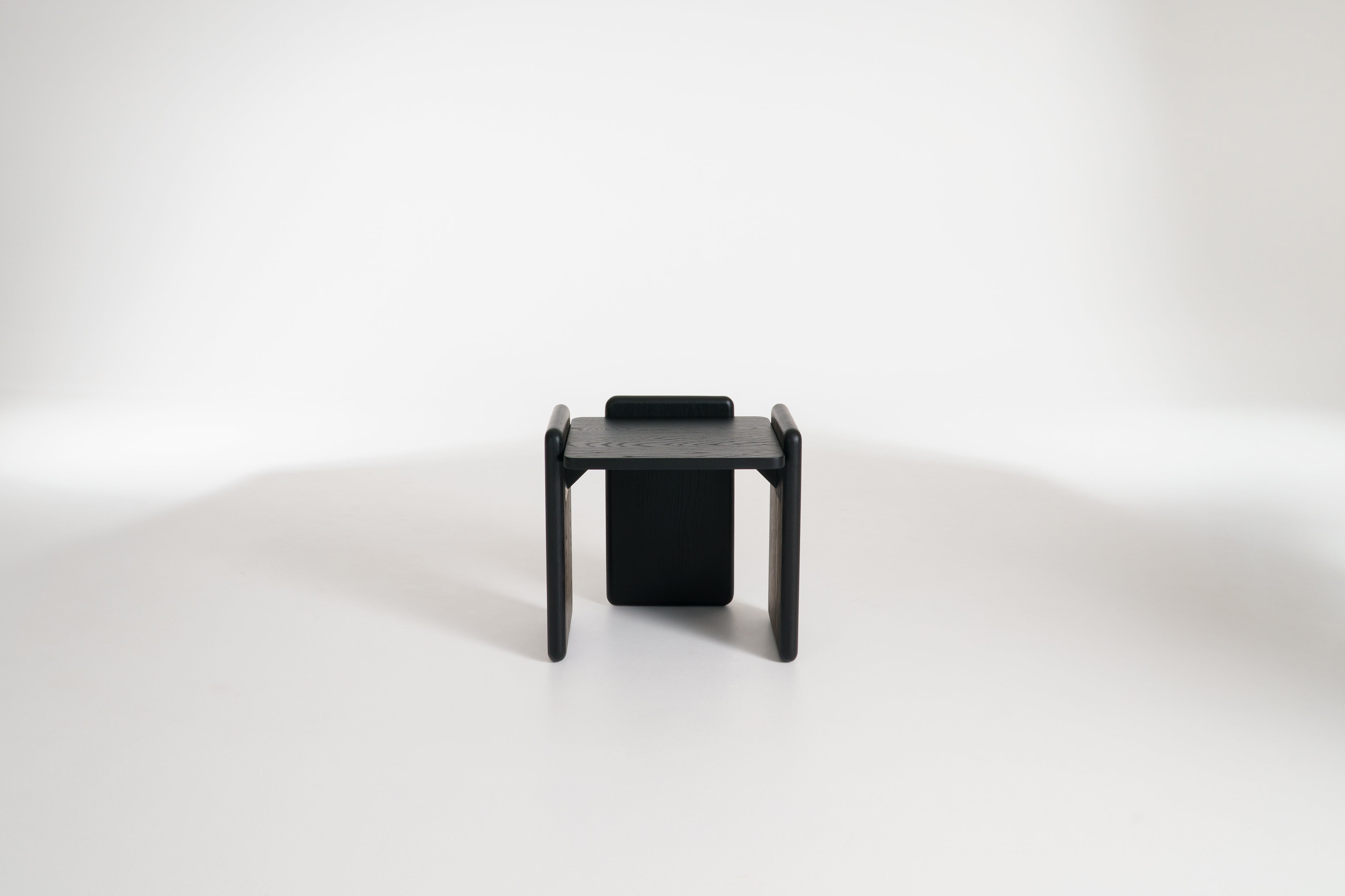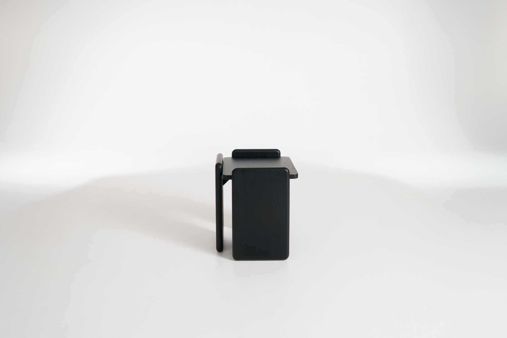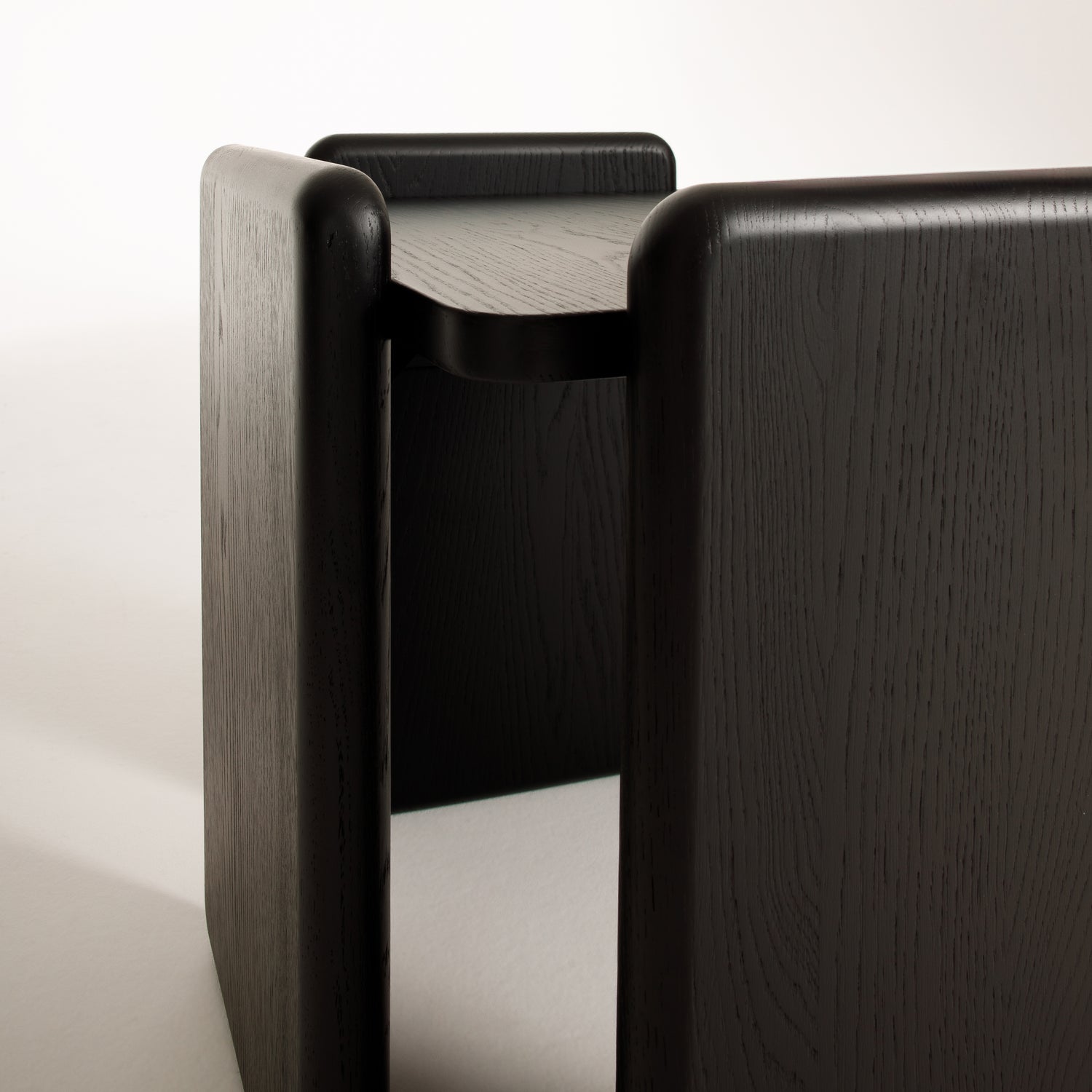 The side table is crafted by hand. Brushed oak side panels, finished in a sleek black lacquer, add a tactile depth and architectural edge. The three-layer plywood reclining surface ensures outstanding stability and durability.